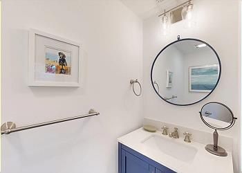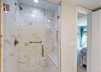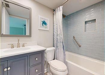 Completing the first floor is the primary bedroom and bathroom. The primary bedroom consists of a swing king bed, which can be converted into two twin beds upon request, a Smart TV and the en-suite primary bathroom. This primary bathroom is beautiful with its custom vanity and elegantly tiled tub and shower combination.