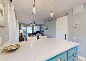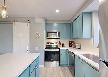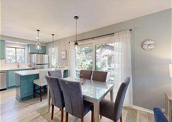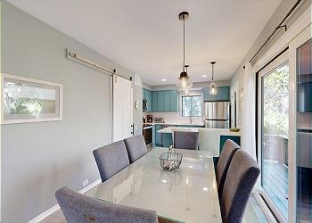 The kitchen is wonderfully updated with custom painted cabinetry, quartz countertops and stainless steel appliances. Coming fully-stocked, you'll find putting together a meal for your family is an enjoyment. The dining area is adjacent to the kitchen and comfortably seats six guests.