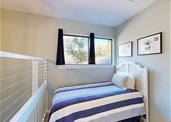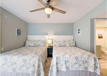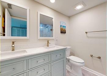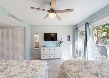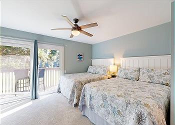 Up the stairs to the second floor there is a landing with a bonus twin bed. The second floor guest bedroom also boasts two queen beds, a Smart TV, along with slider access to a private balcony overlooking the Robert Trent Jones golf course. The en-suite guest bathroom is well done with its quartz-topped two-sink vanity and a large marble tiled walk-in shower.