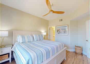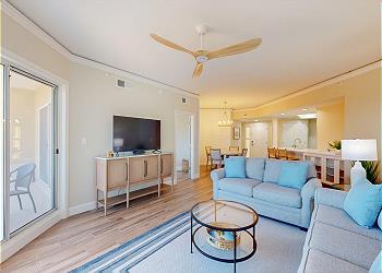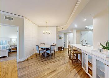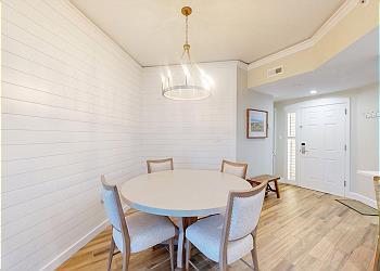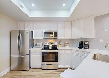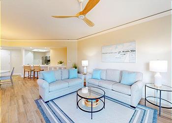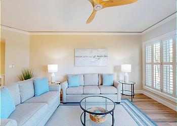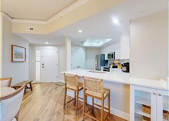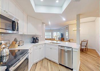 The updated kitchen is both stylish and functional, featuring stainless steel appliances, sleek quartz countertops, and bar seating for two. The kitchen flows seamlessly into the open living and dining area, where coastal-inspired décor, plantation shutters, and an HDTV create an inviting space to relax and unwind.