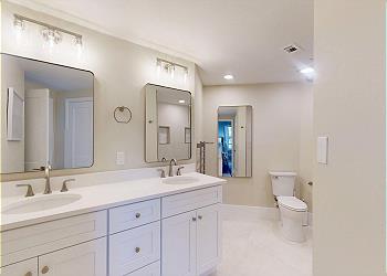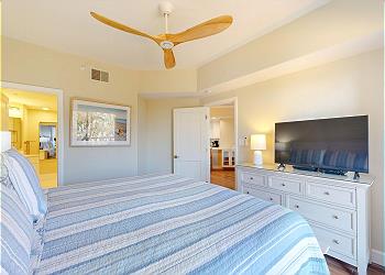 The spacious primary suite serves as a peaceful retreat, complete with a king bed, HDTV, and private balcony access. The beautifully renovated en-suite bathroom features a dual vanity and a large tiled walk-in shower, blending comfort with modern luxury.