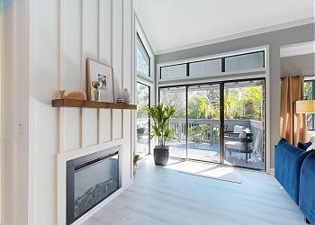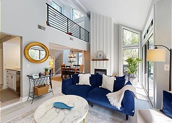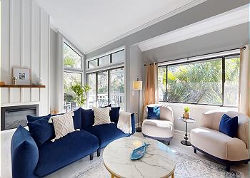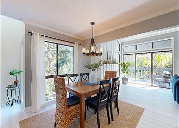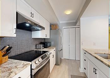 The living room has been recently updated with stylish new furnishings, including a comfortable new couch, a sleek coffee table, a beautiful new rug, and console. A slider in the living room is used to access your private balcony/deck area, which provides outdoor seating for a meal or just a cup of coffee.