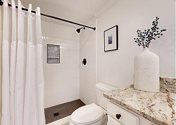 Completing the downstairs areas is a guest bedroom and guest bathroom (bathroom shares for guests). This guest bedroom has two twin beds and plenty of closet space. The guest bathroom is nicely updated and boasts a custom-tiled walk-in shower and accompanying granite-topped vanity.