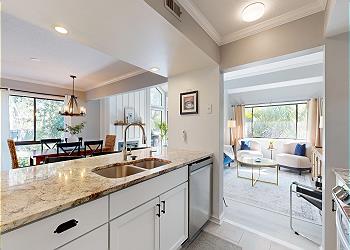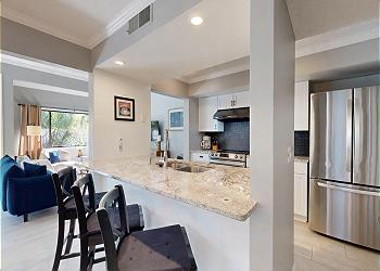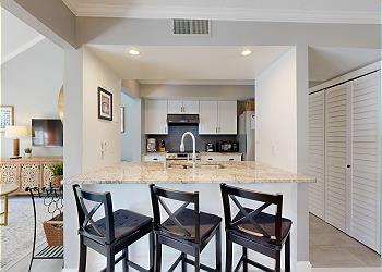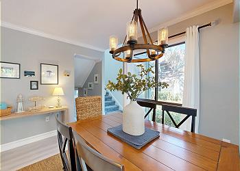 The kitchen is updated with granite countertops and stainless steel appliances. The kitchen will be fully-stocked with the items you may require to cook a meal at your vacation home. A large kitchen island separates the kitchen from the dining area and seats three guests at its bar. The adjacent dining area seats six guests comfortably.