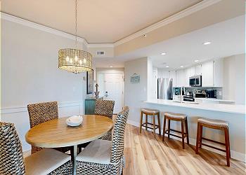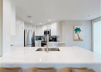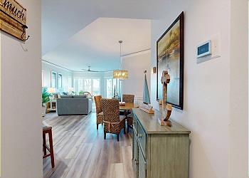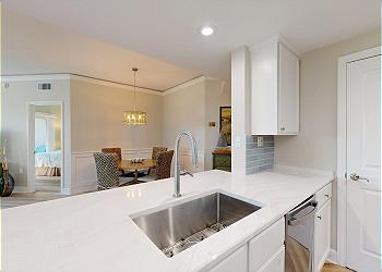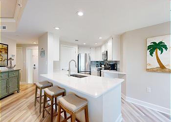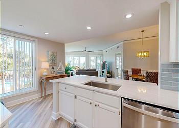 Upon entering, natural light pours through a wall of windows, creating a relaxed and airy coastal setting. The fully equipped kitchen features stainless steel appliances, quartz countertops, and a breakfast bar with seating for three. A stackable washer and dryer is conveniently located within the kitchen area, and the Windsor community pool can be seen directly from the kitchen window.