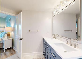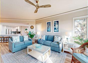 Just off the entry, the hall bathroom offers a single vanity and beautifully tiled walk-in shower. The open living area is designed for comfort, featuring a queen sleeper sofa, matching loveseat, and a 55” Samsung Smart TV, ideal for relaxing after a day at the beach.