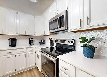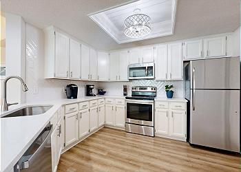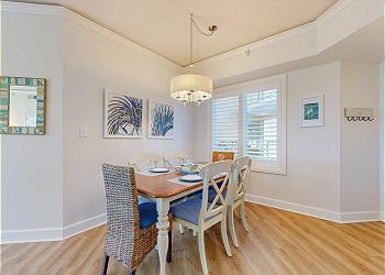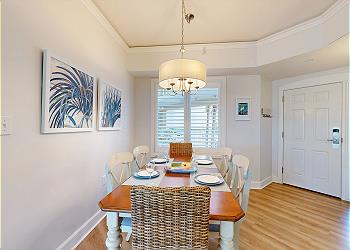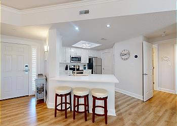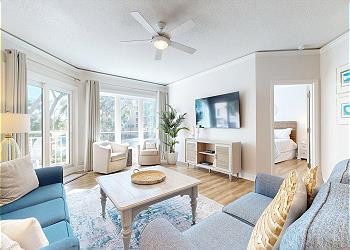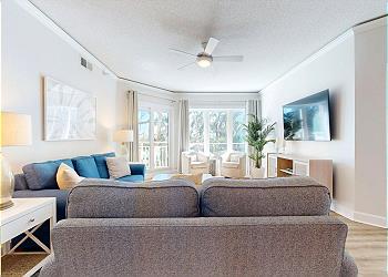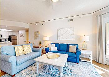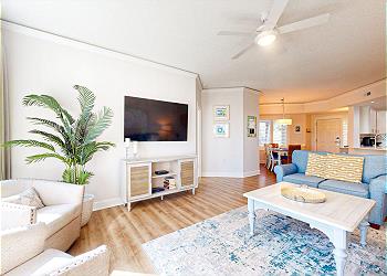 The private balcony is accessed from the spacious living room with its many updates including a new sofa bed, new 65” Smart TV, new window treatments, and new luxury vinyl flooring installed throughout. The fully equipped kitchen has seating at the kitchen bar and the dining area seats six. There’s also seating and a table for 4 on the balcony.