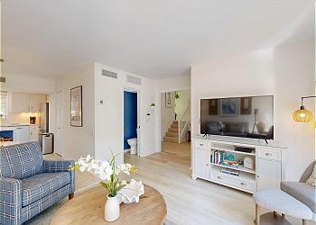 As you enter, you're greeted by a spacious foyer with a staircase, setting the tone for a warm and inviting home. The cozy living room features a plush sofa, two stylish accent chairs, and a large Smart HDTV; ideal for relaxing after a day at the beach or by the pool. Just beyond, a private patio with outdoor dining for 6–8 and a propane grill provides the perfect setting for al fresco meals, with a convenient path leading directly to the community pool.