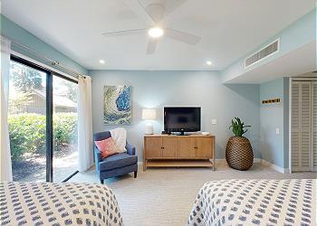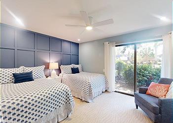 The first-floor bedroom has been thoughtfully updated with new accent pieces, recessed lighting, and a fully renovated ensuite bathroom. It also features two double beds, a flat-screen HDTV, and direct access to the patio—perfect for morning coffee or an evening breeze.