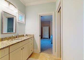 On the first floor, the primary suite features a king bed, HDTV and large en-suite bathroom. The primary bath consists of a custom-tiled walk-in shower, large sunken tub and vanity with two sinks. The first guest bedroom features a double bed and shares the primary bathroom.