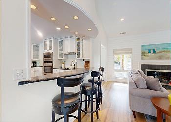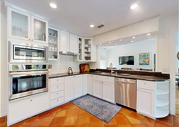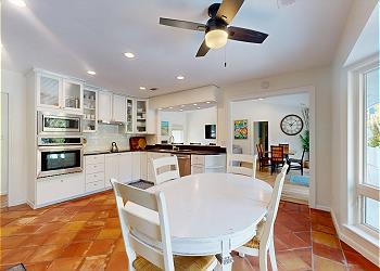 The spacious kitchen is a home chef’s delight, with sleek black countertops, stainless steel appliances including a flat-top stove and seating for three at the breakfast bar. A cozy breakfast nook with an oval table for four makes for the perfect spot to sip coffee and plan the day. A hallway just off the kitchen houses the washer and dryer, plus a full bath with a walk-in shower shared by the nearby the King guest bedroom, complete with a 43” Smart TV.