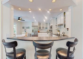On the opposite side of the home, you’ll find three additional bedrooms. One features two queen beds with charming nautical décor and a 32” HDTV. Another is ideal for kids, with two twin-over-full bunk beds and a 32” HDTV for their entertainment. A second hallway bathroom offers a single vanity and walk-in shower. The master suite is a peaceful retreat at the end of the hall, boasting a king bed with a driftwood-style headboard, a 43” HDTV, full-length mirror, and a high-top table for four. The private en-suite bathroom includes a walk-in shower and single vanity.
