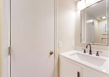 The Primary -suite is on the first floor with its king bed, HDTV and private en-suite bathroom. The newly renovated Primary bathroom features a new quartz vanity and tiled walk-in shower.
