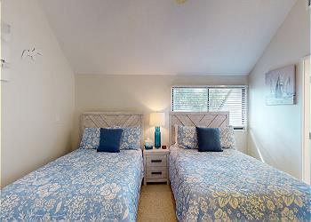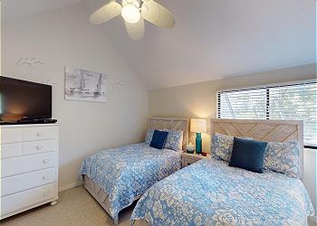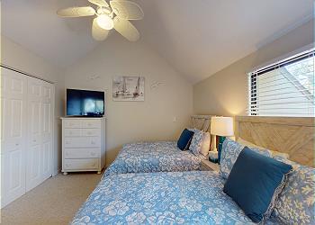 Upstairs, you’ll find two beautifully updated guest bedrooms connected by a Jack-and-Jill bathroom. Both upstairs bedrooms now feature two double beds in each room, providing ample sleeping space for family and friends. Each bedroom is equipped with its own HDTV. The shared guest bathroom includes a tiled tub and shower combination along with a double-sink vanity for added convenience.