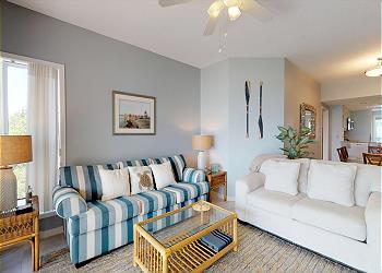 The Nautically-Themed Guest Bedroom consists of Two Twin beds and a Flat Screen TV. The Guest Bathroom is similar in style to the master bathroom. The living room boasts comfortable seating, an HDTV and slider access to your own private ocean view balcony.