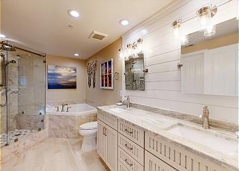 The Primary bedroom features a new king bed and bedding, HDTV, and an en-suite Primary bathroom. The bathroom is incredible with it's custom double vanity, large tiled walk-in shower with rainfall shower head as well as a separate jetted sunken tub. Although the master closet is not available for guest use the large second bedroom closet has more than ample hanging space (as shown in the picture included)