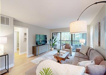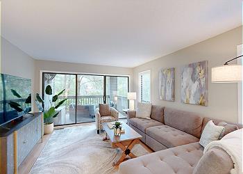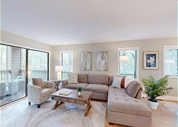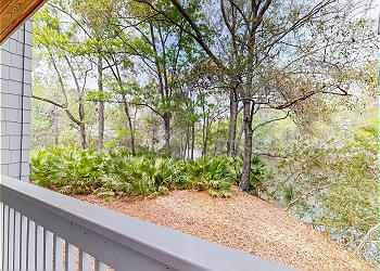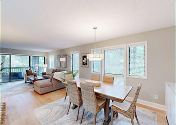 While sitting in the living room, you are surrounded by views of the 11-mile lagoon system and the beautiful natural landscapes that Palmetto Dunes has to offer. The living area has plenty of seating with a comfortable sectional couch and large HD TV to watch all your favorite shows. There is your own private deck right off the living room with a large sectional for lounging on both day and night.