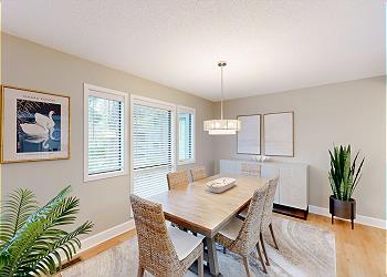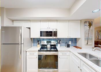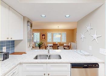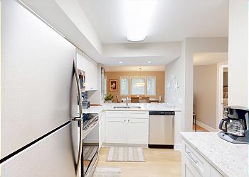 The newly renovated, fully equipped kitchen has custom cabinetry, quartz countertops, and stainless steel appliances. All the amenities of home are here. Whether you need a coffee and bagel in the morning or want to cook a full meal for dinner, you will have all the kitchen supplies needed. The kitchen island has seating for two and opens to the dining room which has seating for seven.