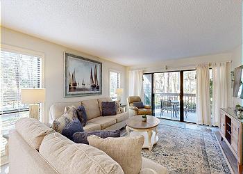 The open and inviting living area features comfortable seating and a Smart HDTV for entertainment, flowing seamlessly onto a private deck overlooking peaceful wooded and lagoon views. This outdoor space is ideal for enjoying morning coffee, unwinding after a day of activities, or simply soaking in the serene surroundings.