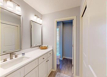 The villa offers two generously sized primary suites, each with its own en-suite bathroom, providing privacy and comfort for all guests. One bathroom was fully renovated in 2026 and features a large tiled walk-in shower adorned with absolutely gorgeous Vita Bella polished porcelain tile, a true spa-like retreat. The second en-suite bathroom includes a tub and shower combination, offering flexibility and convenience.