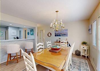 The fully renovated kitchen (2026) is a standout feature, showcasing quartz countertops, stainless steel appliances, and modern finishes. Thoughtfully designed and fully equipped, it provides everything you need to prepare meals with ease whether it’s a quick breakfast before the beach or a family dinner at home. Adjacent to the kitchen, the dining area offers seating for six, making it perfect for gathering and sharing meals.