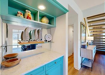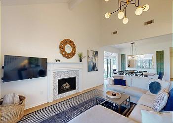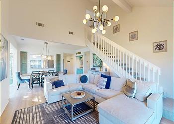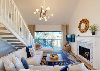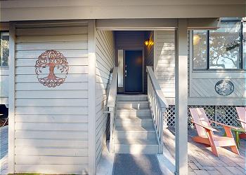 The spacious living room boasts vaulted ceilings, a comfortable sectional, HDTV, and expansive sliding glass doors that open to the private deck. A striking floating staircase leads to the upstairs bedroom, adding architectural charm to the space.