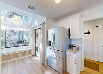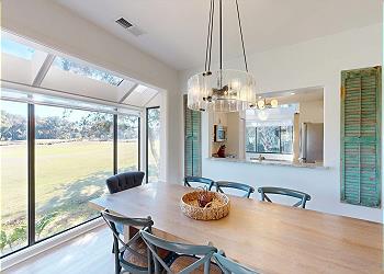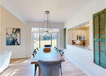 As you enter, you’re greeted by a fully equipped kitchen featuring stainless-steel appliances, ample counter space, and a convenient pass-through window overlooking the formal dining room. A cozy sitting area just off the kitchen includes a full-size washer and dryer for added convenience. The formal dining room seats eight comfortably and showcases serene views of the golf course.