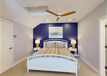 The primary suite, located on the first floor, features a king bed, HDTV, and direct access to the private deck; perfect for enjoying morning coffee with golf course views. The ensuite bathroom includes a double-sink vanity and a large tiled walk-in shower. A second guest bedroom on the main level offers two twin beds and a daybed, with a shared hallway bathroom featuring a walk-in shower.